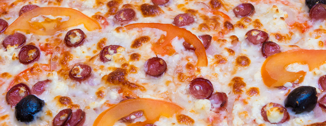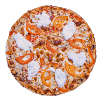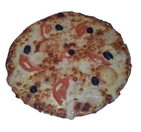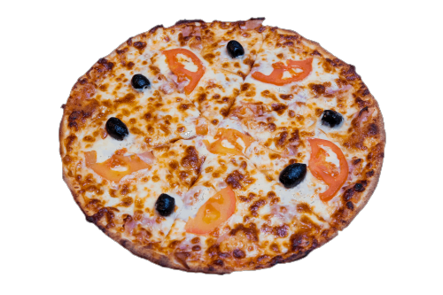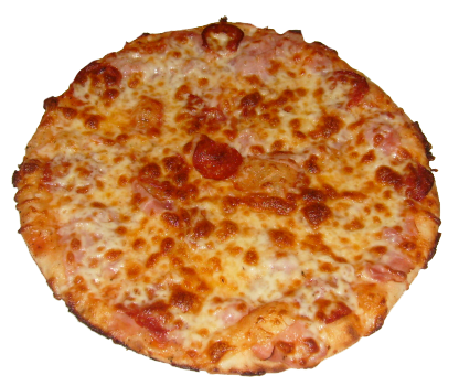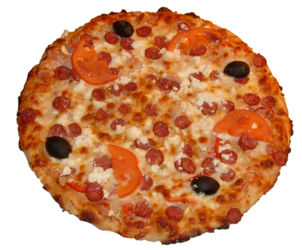 Sos rosii, jambon, carnati oltenesti, ceapa, ardei gras, masline, rosii, branza telemea, mozzarela