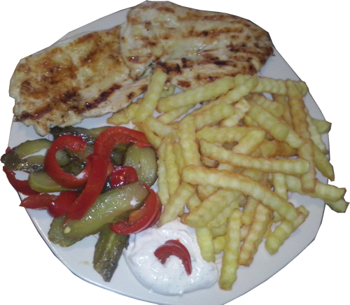 piept pui, cartofi prajiti ,castraveti acri,gogosari acri,sos usturoi,lipie