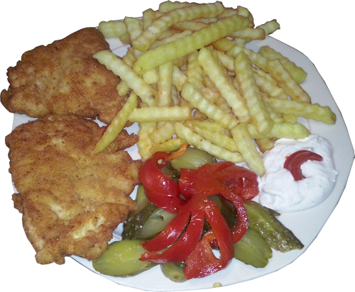 snitel pui,cartofii prajiti ,castraveti acri,gogosari acri,sos usturoi,lipie