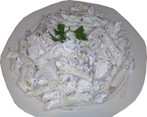 Paste pene , piept de pui , ciuperci , smantana , ou , ulei masline , parmigiano,busuioc, oregano, sare pipe