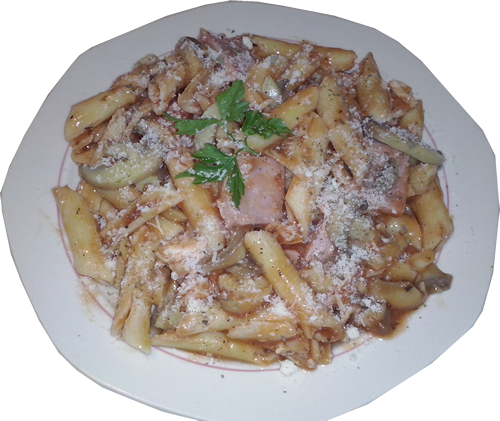 Paste pene , sunca , ciuperci , sos pomodoro , usturoi , ulei masline , parmigiano, busuioc, oregano, sare piper